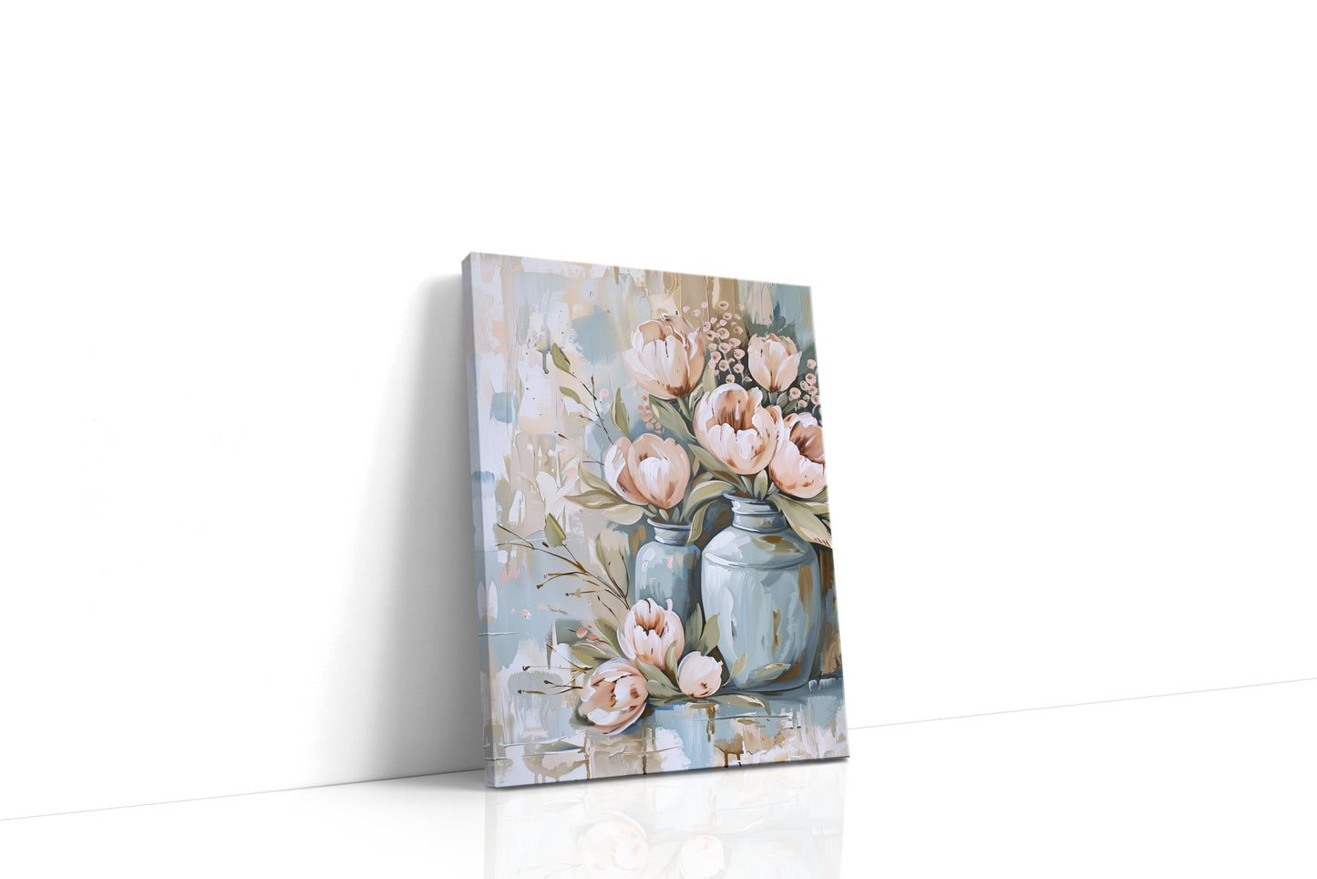 Tento obraz představuje klasické zátiší s jarními květy umístěnými v elegantní skleněné váze. Malba je provedena v jemných pastelových barvách, které evokují pocit klidu a oživení, charakteristické pro jarní období. Kompozice spojuje klasické prvky s moderními štětci, čímž vytváří svěží a zároveň nostalgický výjev.